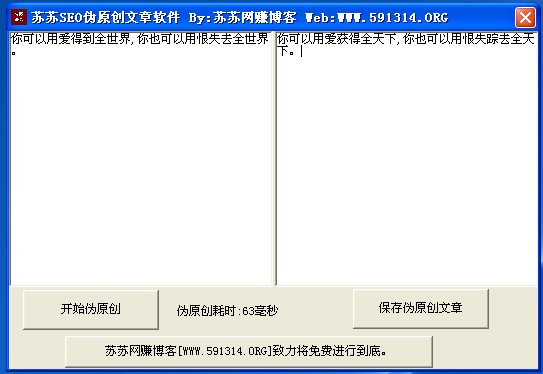 左边的编辑框是放文章的,然后点开始伪原创,伪原创好的文章在右边的编辑框,然后可以保存,保存好的文章在软件根目录的,伪原创文章.txt 里面。