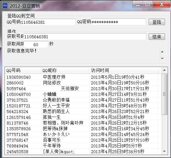 qq精准访客提取器,附带注册机,可以快读的提取qq达人的空间访客,提取邮箱和qq号码,可以自己设置更新提取时间,做精准营销很方便。