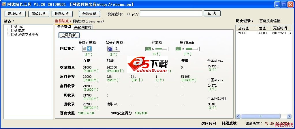 查询站点的爱站网百度权重、站长工具百度权重、Google Pagerank、Sogou指数、Alexa世界排名、中国网站排名、360安全得分,以及在几大主要搜索引擎中的收录反向链接的情况,并及时反映与上次查询结果的差异值。