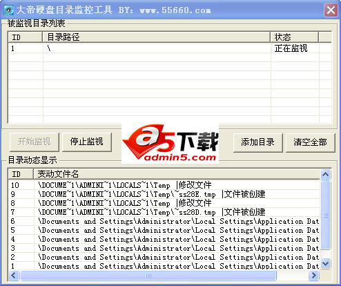 大帝硬盘目录监控工具可以在电脑裸奔的状态下监控硬盘中各个目录中的文件读写状态。采用多线程监控技术,占用内存仅用460KB。