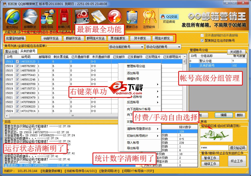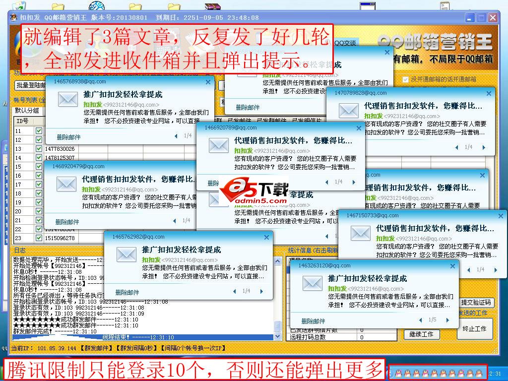 QQ邮箱营销王/QQ邮件群发/QQ群邮件群发/漂流瓶群发/贺卡群发/明信片群发/自动开通群邮件/批量提取群成员/好友,批量邮件订阅功能、完美的参数设置、多线程操作、多文本随机发送、多种换IP方式 第三方自动打码。