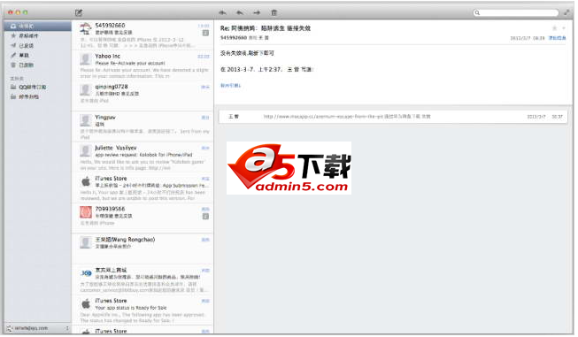 Foxmail为你那绚丽夺目的Retina显示屏而特地做的优化覆盖了界面上每一个像素的细节。在这里,你所看到的每一个图标,每一处文字,均是如此细腻。
