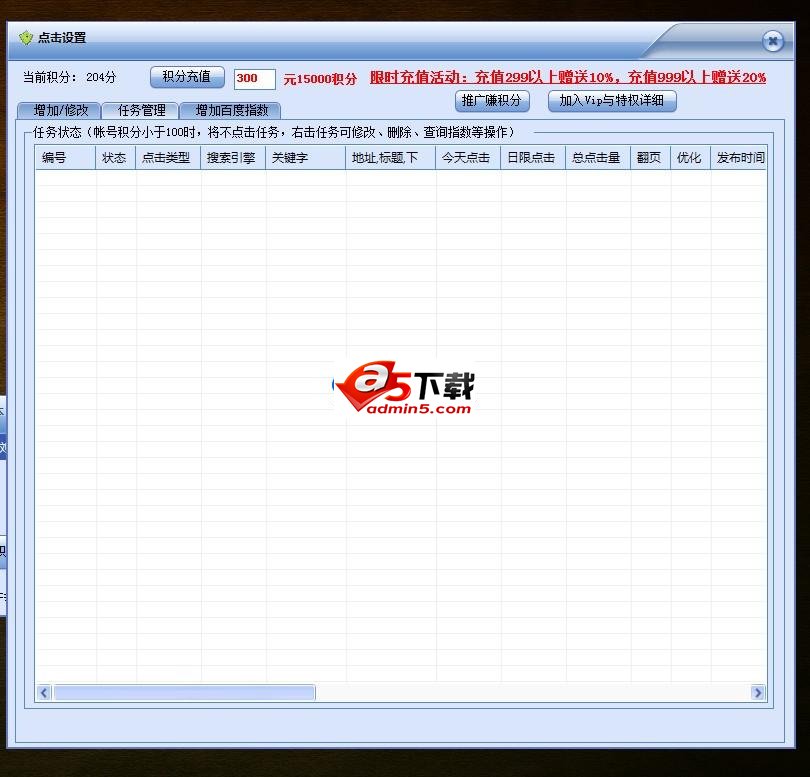 如果不想挂机可以购买积分,购买积分流程:登入软件-->我的点击管理-->点击充值按钮即可,想充多少积分自己决定