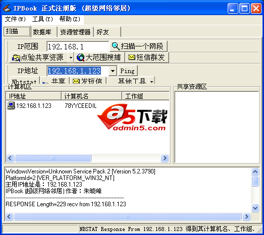 3、查出Internet上任意IP地址的计算机名,工作组和共享资源。并且可以进行Ping,Nbtstat等操作。