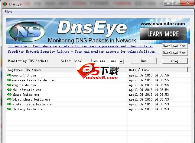 nds数据包监视(DnsEye)在网络域名系统DNS数据包捕获和显示的主机名解析信息。该软件可以监视网络请求的URL,它在浏览器中打开和保存捕获文件中的DNS名称列表。 DnsEye还具有一个非常友好的用户界面。