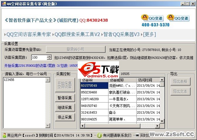 QQ空间访客采集专家是一款可以批量采集QQ空间访客的工具,只需要您输入一个或多个源QQ,便可以一键采集访问过该QQ空间的访客信息(访客QQ、访客昵称、访问时间),支持多层采集(比如采集123456的访客84302438,程序可以继续采集84302438的子访客,自定义层数,以此类推,无限循环采集)!此功能用于采集抓取精准的QQ客户,可以采集竞争对手空间的访客,便于营销!支持导出到表格或者文本!第二代V2全面升级支持:定时循环监控采集访客、过滤指定日期访客、自动保存访客。更支持QQ空间动态浏览访客采集(一般好友刷新空间的时候会留下痕迹在动态浏览里,类似于抓取竞争对手的好友,超强功能)请注意:同样是有权限才行,没有权限仍然采集不了