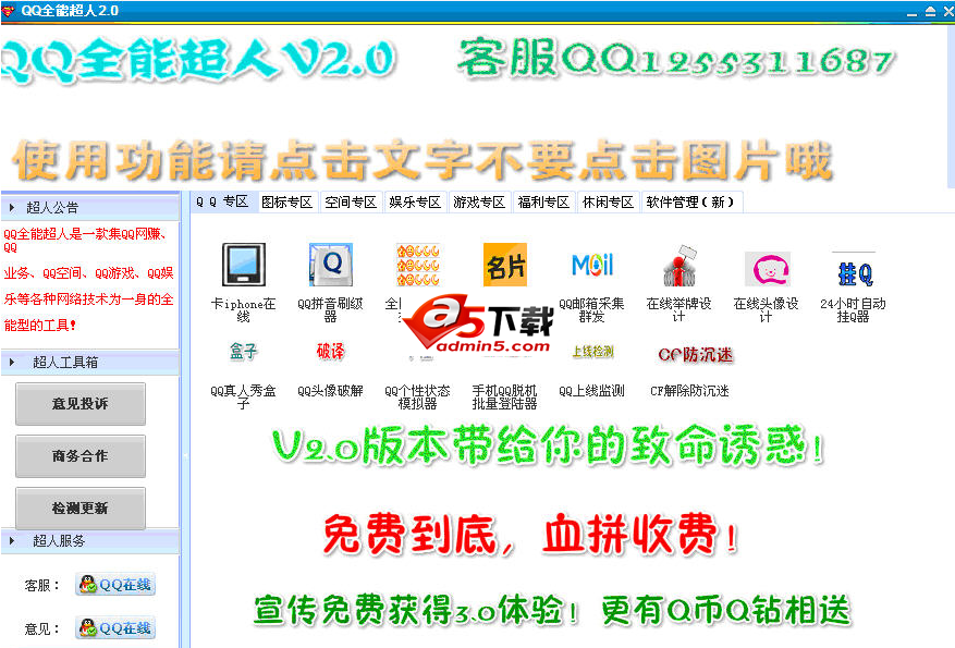 QQ全能超人是一款QQ业务,QQ空间,QQ游戏,QQ娱乐等各种网络技术为一身的全能工具。