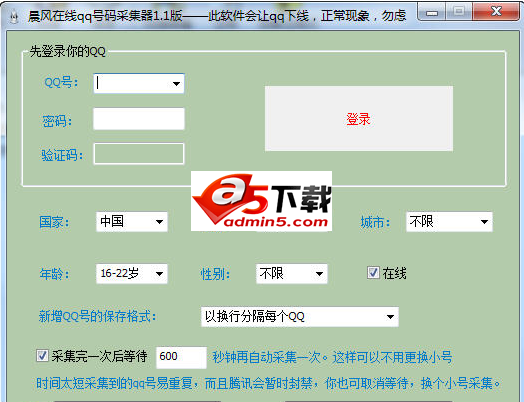 晨风在线qq号码采集器是一款免费无限制的在线qq号码采集器,你可以按照国家、省份、城市、年龄、男女等不同条件采集在线(或不在线)qq号码列表。软件可以智能剔除之前采集过的号码,采集到的qq号码以地区年龄采集时间等信息分开保存,大大方便用户的管理。