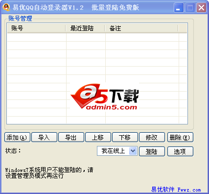 QQ批量登陆助手是一款方便您管理和登录多个QQ帐号,而免去为每一个QQ号码反复输入号码与密码的免费工具,同时您还能通过QQ批量登陆助手方便管理您的多个QQ帐号,它具备显示上次登录时间和密码提示等实用功能,方便您注意您的QQ号码的使用频率。QQ批量登陆助手加密保存您的密码,杜绝了各类盗QQ密码的木马,它是您管理多个QQ必不可少的好工具!另外还支持“隐藏”登录,“隐藏”登录后的QQ自动隐藏在后台,在系统托盘里也找不到QQ的踪影,更有操作方便的QQ多账号自动登录功能……还不赶快下载尝试?!