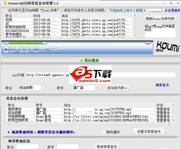 KoumiQQ空间背景音乐管理是一款可以方便管理背景音乐·可将QQ音乐正版320K超高品质歌曲设置为背景音乐。不用再为不方便管理QQ空间的背景音乐而烦恼,不用再为找不到高品质的背景音乐而烦恼,不用再为找不到能流畅播放的背景音乐而烦恼。即刻拥有,即可解除所有烦恼。