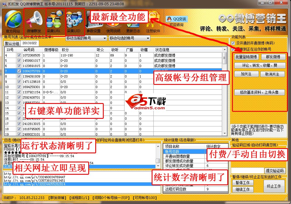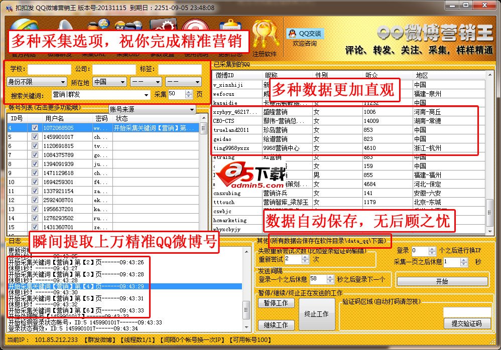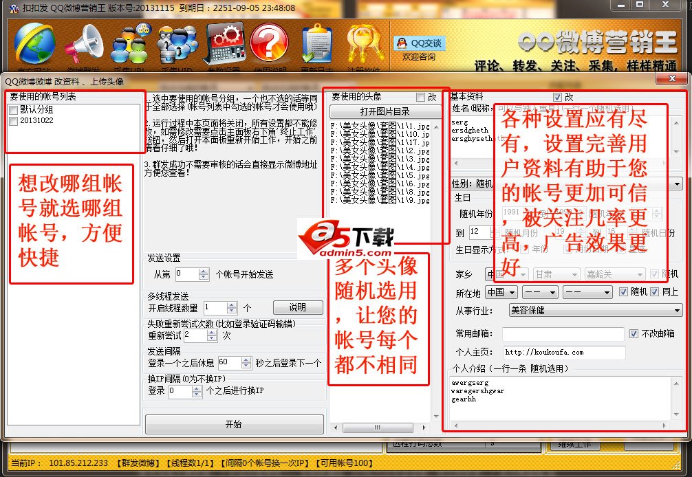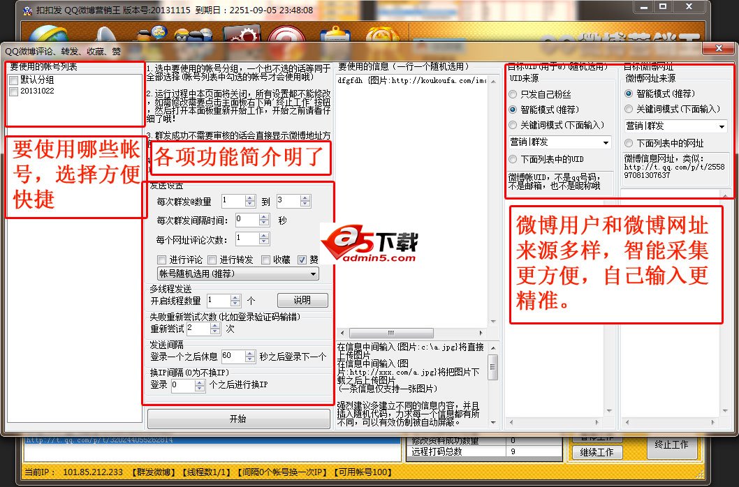 扣扣发QQ微博营销王, 全自动采集用户和微博网址,批量评论微博,批量转发微博,批量收藏微博,批量关注,批量取消关注,批量修改基本资料,批量修改头像,批量开通微博,多种换IP方式 第三方自动打码。