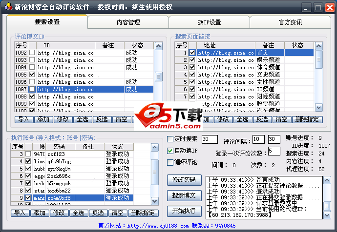 新浪博客评论软件具有定时搜索博文,快速账号登录、自动验证码识别、多账号自动切换、博文循环评论、评论内容自定义变量、并且支持代理ip,宽带拨号和vpn换ip功能,是产品推广的必备利器