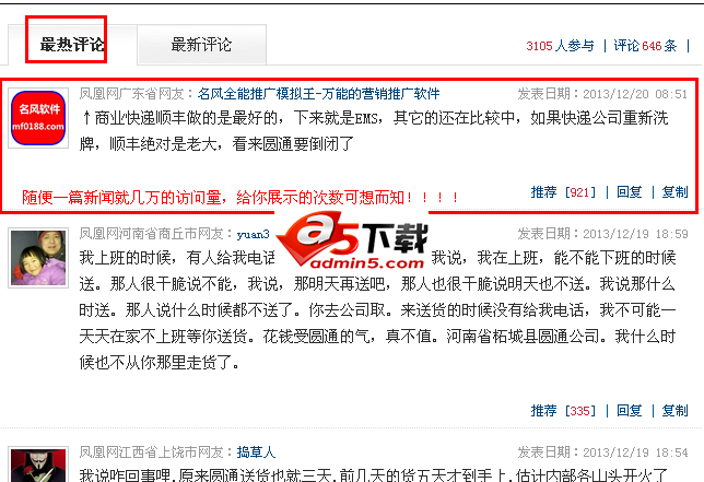 凤凰新闻网是中国领先的综合门户网站,有着巨大的流量,凤凰新闻自动评论推荐软件可以自动搜索热门新闻进行自动评论,并且可以把自己的评论推荐到最前面,然后通过头像、用户名或者评论内容进行展示。可想而知,每个新闻的访问量几百到几十万,给你展示的效果远远超过付费广告
