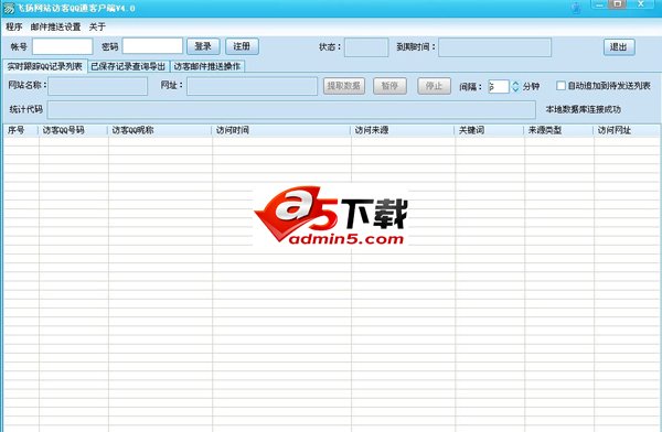 第三步,登录软件,点击“提取数据”,软件会自动提取服务器上跟踪到的您网站的访客的QQ数据,实时显示在"实时跟踪QQ记录列表",比同时保存到软件本地数据库中。以备随时查询数据。