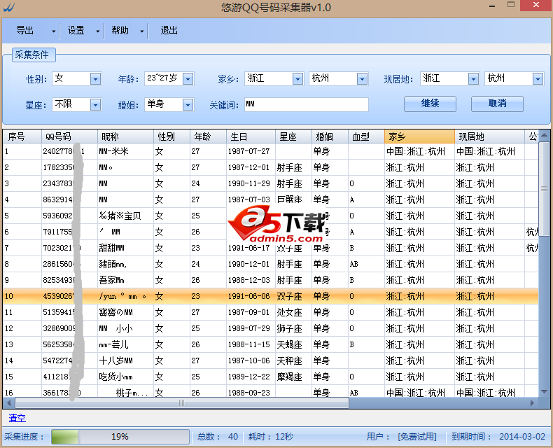 悠游QQ号码采集器是一款用于采集QQ和QQ邮箱的工具,可以根据性别、年龄、家乡、现居地、星座、婚姻、关键词等条件进行采集。支持导出的数据丰富,并且支持导出到文本文件和Excel。