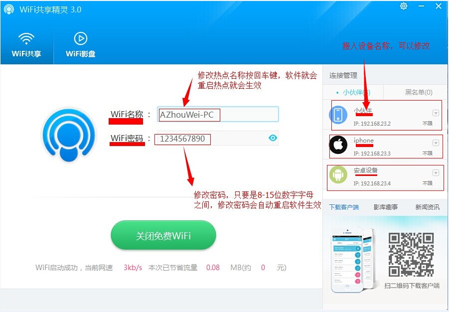 使用方便:智能识别互联网网卡和无线网卡,无需手工选择。智能一键开启WIFI共享,简单方便,无压力;
