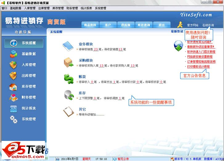易特进销存 商贸版是一款专业的进销存软件。软件采用安全稳定的数据库管理系统设计,适用于大中小型企业、生产厂等,功能强大,可以实现包括进采购、采购退货、销售、销售退货、物料领用、领料退回、库存盘点、仓库调拨、借入、借出、借入还出、借出还入,供方客户资料管理,供方供货汇总、明细报表,客户供货汇总、明细报表,部门领用汇总、明细报表、仓库汇总、明细报表等诸多功能。易特进销存 商贸版界面友好,所见即所得,操作简便,使用方便,速度快,质量高,对于用户来说是一款很不错的软件,小编这里推荐大家使用这款软件!