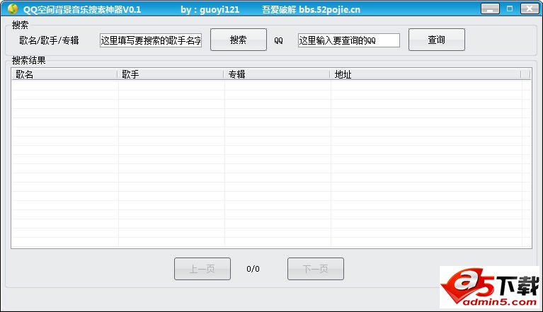 吾爱破解QQ空间背景音乐搜索神器是一款QQ空间背景音乐搜索软件,使用该软件能够对关键词进行音乐搜索,也可以对你喜欢的好友QQ空间背景音乐进行搜索,是一款不错的QQ空间背景音乐搜索软件~