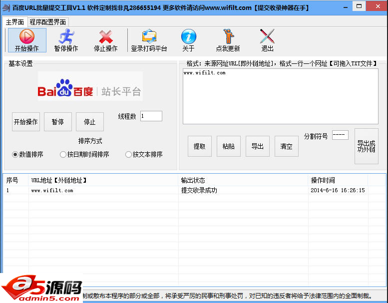 百度url批量提交工具是一款能够批量提交URL引导蜘蛛的软件,该软件以前是可以自动识别验证码,现在变成中文的验证码了,识别不了,只能远程打码和手工操作。 百度url批量提交工具软件功能: 1.智能提取自己网站的url(免去手动复制的麻烦) 2.批量ping给百度和谷歌(无验证码。不限网址数量) 3.批量站长工具提交(有验证码。支持远程打码和手动打码) 4.可以最小化到托盘后台工作!不影响其他工作!