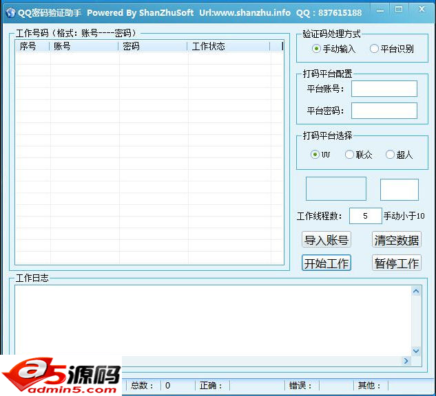使用方法:点击导入数据,如果选择平台识别,请填好相应的平台账号和密码,手动打码工作线程为5即可。