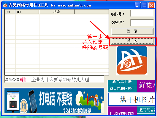 导入 或者手动添加QQ号后(导入格式:QQ号码-----密码)