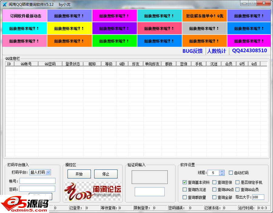 闽淘QQ晒密软件是一款QQ号批量登陆辅助工具,方便验证QQ密码正确是否及查询号码已开通的业务状态等。