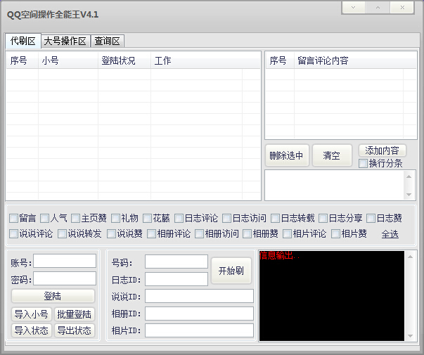 QQ空间全能王,包含代刷区[18种功能],大号操作区[添加好友,新动态抢评论,赞,等等..]查询区[查询QQ空间等一些..]