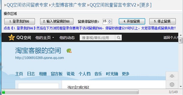 注意:在这里提示下,间隔一定要在15秒以上,网速卡的话要适当增加,否则会造成留痕失败,1个QQ一 般可以留痕10几次到几十次不等,腾讯的限制,软件无法突破的,软件仅模拟替代手工模拟访问空间, 具体每个QQ能留痕多少没有具体数字,请自行测试。
