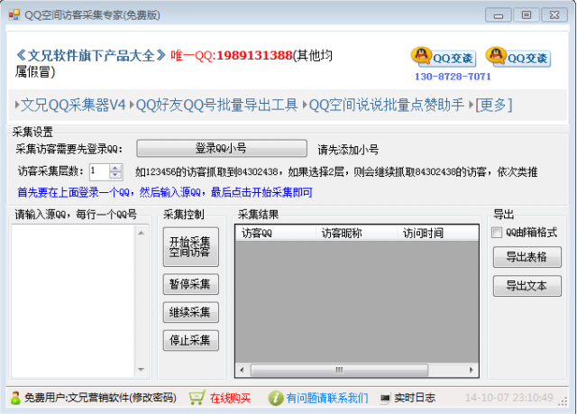 《QQ空间访客采集专家》是一款可以批量采集QQ空间访客的工具,只需要您输入一个或多个源QQ,便可以一键采集访问过该QQ空间的访客信息(访客QQ、访客昵称、访问时间),支持多层采集(比如采集123456的访客1989131388,程序可以继续采集1989131388的子访客,自定义层数,以此类推,无限循环采集)!此功能用于采集抓取精准的QQ客户,可以采集竞争对手空间的访客,便于营销!支持导出到表格或者文本!