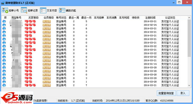 开发刷单管理助手的初始目的是为了方便刷手在刷单时提供各类便利,不在为单子搞得手忙脚乱,被众多小号搞得手忙脚乱。一键式管理,查询,录入等特色功能。