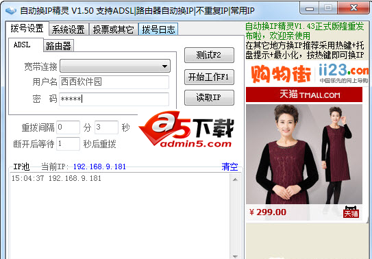 ADSL自动换IP软件是一款自动更换IP的小软件,IP自动换,可以在用户设定的时间内自动断开ADSL或路由器的网络信号,并自动重新连接,省去手功频繁连接、断开网络的情况,可用于网络投票、游戏相关程序中。本软件使用方法也是挺简单的,如果你是ADSL用户,只需输入ADSL的用户名和密码(宽带运营商给您的密码),设置重拨间隔、断开后等待间隔,软件即可开始工作。如果是路由器的话,同样需要输入用户名和密码,但路由器必须是列表中支持的型号。