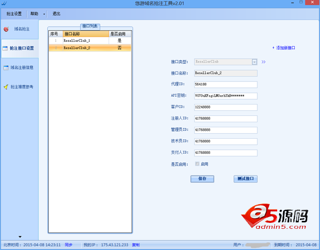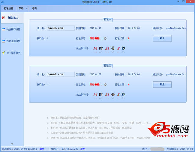 1、使用本软件抢注到的域名,抢到就是你的,不需再参与竞价。 2、域名删除时间一般都在凌晨和深夜,不用再苦苦熬夜,删除时间临近软件自动开始抢注 3、软件目前支持ResellerClub接口抢注,实际抢注时请确保接口帐户内的足够注册域名的余额。(今后将加入更多接口支持) 4、抢注前请先同步好时间,设置好IP白名单,并且“测试接口”成功后再开始抢注,以免设置错误导致抢注失败。