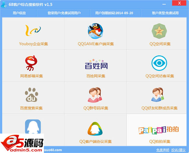 友邦QQ综合采集搜索软件是一款综合的客户信息采集软件,支持youboy企业用户采集、QQGame客户端采集、QQ空间采集、网易邮箱采集、百姓网采集、QQ空间访客采集、百度搜索采集、QQ群号码采集、QQ好友和群成员采集、QQ客户端采集、QQ拍拍采集等众多信息,采集速度快、精确度高、资源广,是您做营销、找意向客户的必备工具!