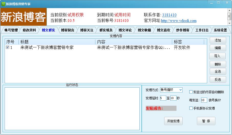 5.支持批量发表博文,可按帐号或内容循环模式发表。
