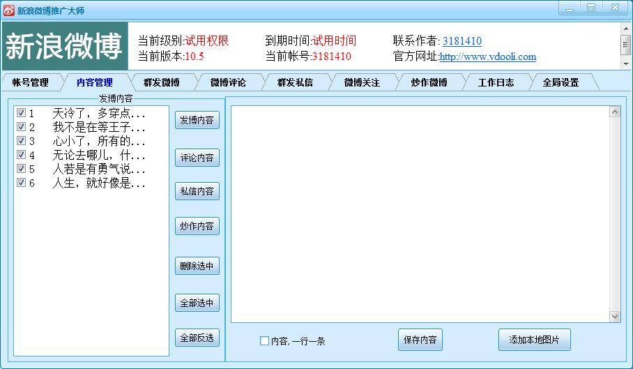 V动力新浪微博推广大师是一款微博推广辅助软件、群发、推广、营销等,让用户更好的体验微博的魅力