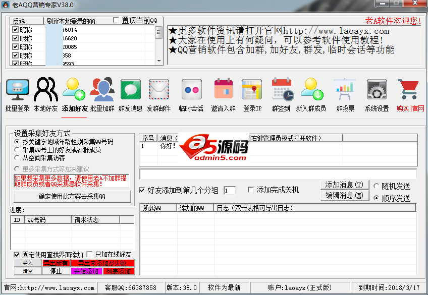 老AQQ营销软件,一款多功能的QQ营销软件,内置:批量自动登录QQ、采集群成员、自动加QQ好友、自动加QQ群、自动群发、自动发群邮件、发送临时会话、常用ip检测、一键群签到、一键发起群投票、新入群群成员QQ采集、邀请好友入群、辅助设置等功能,软件快速、稳定、操作简单、升级及时、辅助设置功能强大,有效的使用该软件将让您的推广效果事半功倍!