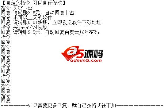 在配置文件[自定义回复.txt]中配置你的指令内容跟回复内容,此指令可以配合转账回复指令,两者搭配,微商无敌