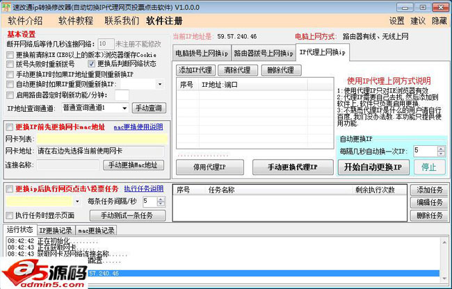 一、全自动切换IP功能 软件可以设置隔多久自动换一次IP,适合ADSL拨号上网及路由器拨号上网自动换IP;可以指定多个时间段换ip、可以设置每隔多少秒更换一次IP 二、全自动投票功能 可以设置更换IP成功后自动投票 三、全自动网页点击功能 可以添加多个网页点击任务,可以设置更换IP成功后执行网页点击任务; 四、自动更换mac网卡地址