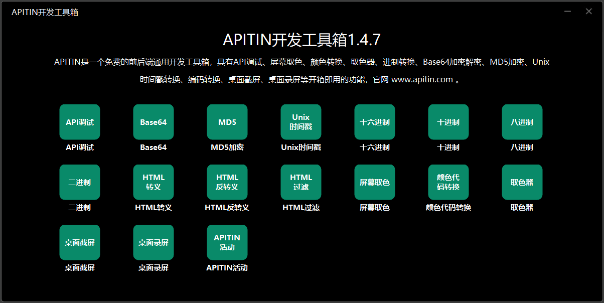 APITIN是一个免费的前后端通用开发工具箱,具有API调试、屏幕取色、颜色转换、取色器、进制转换、Base64加密解密、MD5加密、Unix时间戳转换、编码转换、HTML字符转义、HTML字符反转义、HTML标签过滤、桌面截屏、桌面录屏等开箱即用的功能。