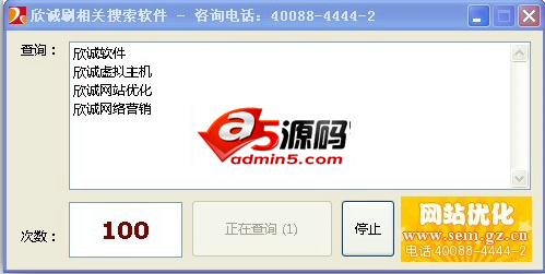 在"查询"框里面输入你想查询的词,一行一个词,然后在"次数"框里面输入次数(阿拉伯数字1~9),点开始查询即OK,由于收集了国内外搜索引擎,可能查询有点慢(230秒一次),最小化然后慢慢做其它工作去吧,呵呵