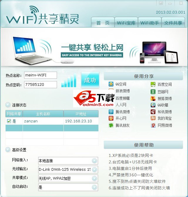 WIFI共享精灵官网下载(笔记本设置wifi热点)软件版本: 2014.04.25.001