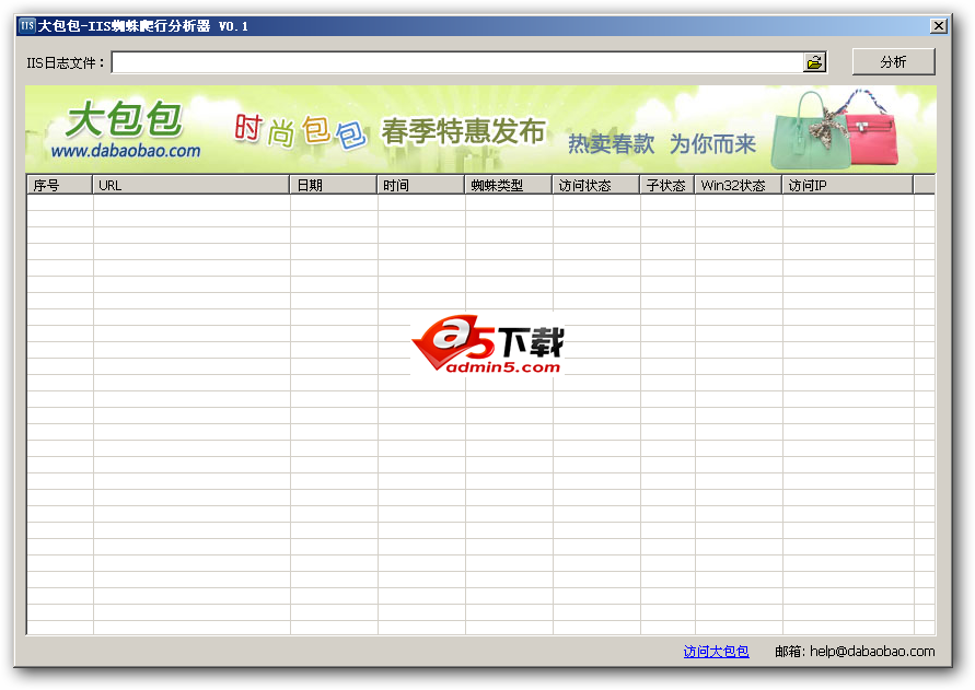 大包包-IIS蜘蛛爬行分析器可以完美的统计IIS网站的.log格式文件中的搜索引擎蜘蛛的访问次数,协助站长了解搜索引擎对你网站的爬行情况,总结搜索引擎规律。是SEO人员,网站管理人员的必备工具,强烈推荐。
