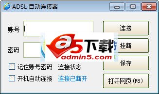 【基本介绍】 宽带(ADSL)开机自动连接设置器是独享宽带上网免手动连接的好助手,使用此软件设置后,以后开机就可以上网,免去开手动拨号的麻烦.实现路由器一个小小的效果.使用本软件设置之前,请先确保您机器可以正常手 动拨号连接可以正常上网! 程序是由一个网友要求帮忙写的,所以就发出来给大家共享.希望大家把自己需要的告诉我们,我们尽力去完成您的想法. 注意:使用路由器的朋友就不要用本软件了 【更新日志】 修改使用协议 去掉了自动修改、锁定IE主页 对以前的用户表示歉意,谢谢你们的支持!