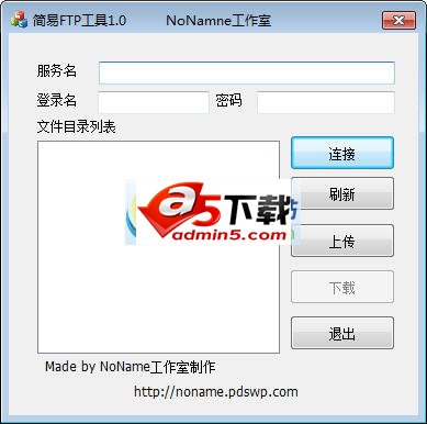 NoName快速FTP工具是由NoName工作室领衔制作的一款FTP工具软件,使用方便快捷,小巧无需安装,可随时携带。 NoName快速FTP工具使用方法: 输入服务名、登录名和密码。点击连接,提示连接成功。 点击文件,再点击下载按钮即可下载。 []中的为文件夹,双击打开文件夹。 [..]为根目录,双击返回上一层目录。