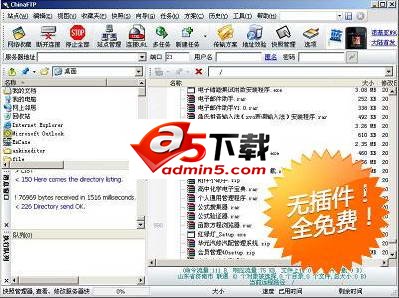 ChinaFTP是一款完全由国人开发的免费的FTP客户端软件 ,软件支持对文件传输的所有操作,支持MSDOS和Unix两种目录结构。 ChinaFTP与服务器的交互快,文件传输速度快,支持整个目录及子目录的上传,软件包含站点管理,方便用户对所访问的站点进行访问保存,无需每次访问时都输入服务器名、用户名和密码。简单的操作和方便的管理,软件界面清晰,左侧为本地磁盘文件,右侧为FTP文件服务器。文件上传下载显示进度查看、已传送字节、传输速度显示、服务器状态显示等。