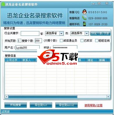 迅龙企业名录搜索软件的用法非常简单,启动软件输入行业关键词,选择省份、城市便能开始搜索企业名录数据,同时可设置开始页数、搜索个数、是否诚信通会员、是否认证、旺旺是否在线等条件,搜索完毕后软件会提示已搜索完毕,接着可将搜索到的数据导出为EXCEL或TXT文件。未注册版本可以搜索20条数据,数据不能导出到文件。