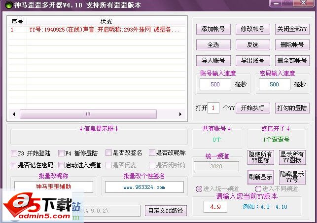 YY神马多开器功能无限YY多开[不掉线]、自动登陆、自动进频,显示YY数字ID、一键退出所有YY号、半自动注册YY号。