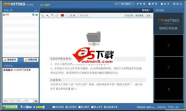 OM 视频会议免费版系统模拟出与现实会议毫无二致的交互环境,甚至比现实会议更易于操作,主持人打开文档,所有参会者同步观看,辅助以电子教鞭和电子白板讲解,中间可以插入播放视频和图片等,通过文字与参会者实现互动,并且,整个过程可同步录制成课件,以备参会者随时点播观看。