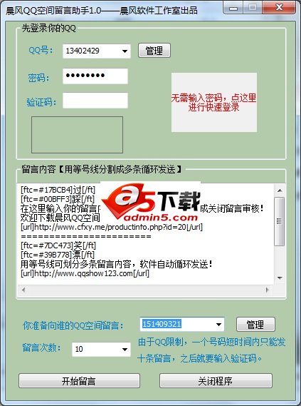 晨风QQ空间留言助手,支持多段内容循环发送,支持各种留言代码,支持验证码自动提取,支持多qq号迅速切换发送,支持待留言qq号的保存和管理。软件各种操作设置和留言内容,都能自动保存,最简化你的操作。