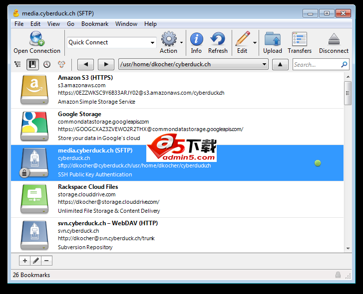 Cyberduck是一个免费开源的FTP客户端工具,它支持快速查找、远程文本编辑等功能,提供windows 和 mac os 版本。